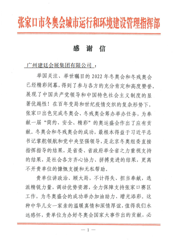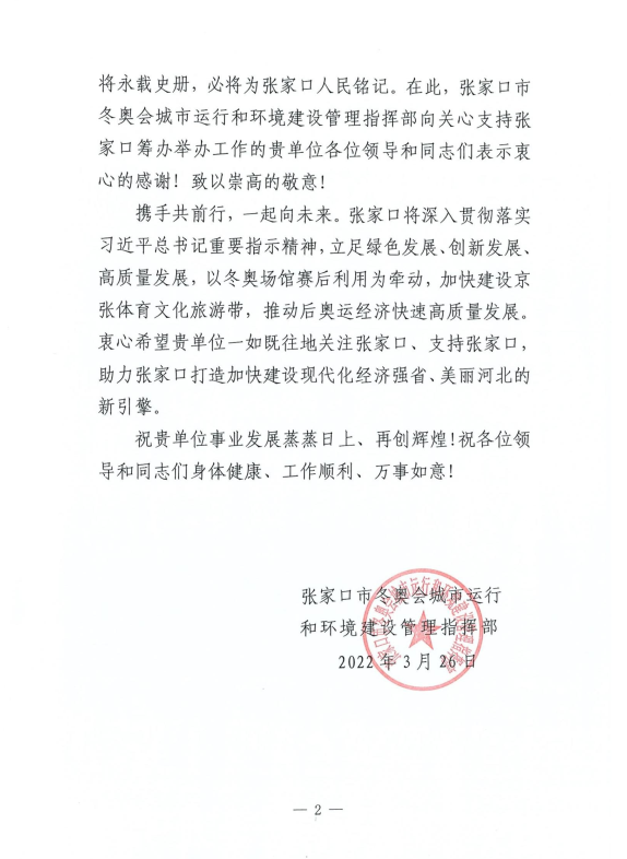 貴單位講政治、顧大局,不計得失、擔當奉獻,選派精銳力量,調(diào)動優(yōu)勢資源,全力保障支持張家口賽區(qū)工作,為冬奧盛會的成功舉辦加油助力、增光添彩。這種中華兒女一家親的溫暖真情和深情厚誼,值得我們永遠感懷,貴單位為辦好冬奧會國家大事作出的貢獻,必將永載史冊,必將為張家口人民銘記。在此,張家口市冬奧會城市運行和環(huán)境建設管理指揮部向關心支持張家口籌辦舉辦工作的貴單位各位領導和同志們表示衷心的感謝!致以崇高的敬意!