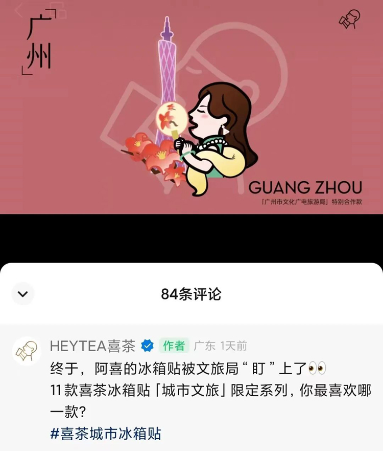 前天,喜茶在官微發(fā)布城市文旅系列冰箱貼套裝兌換的預告,僅兩三個小時閱讀量就突破10萬+,評論都是表達對不同城市冰箱貼設計的喜愛。